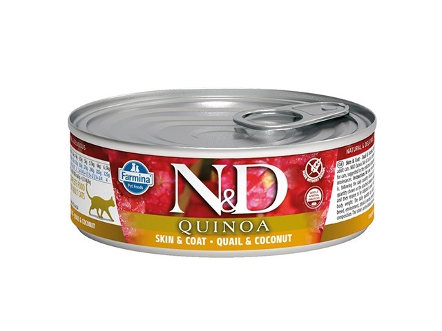 N&D Quinoa Skin & Coat je kompletné diétne krmivo pre mačky, odporúčané na zníženie neznášanlivosti voči zložkám a živinám krmív.