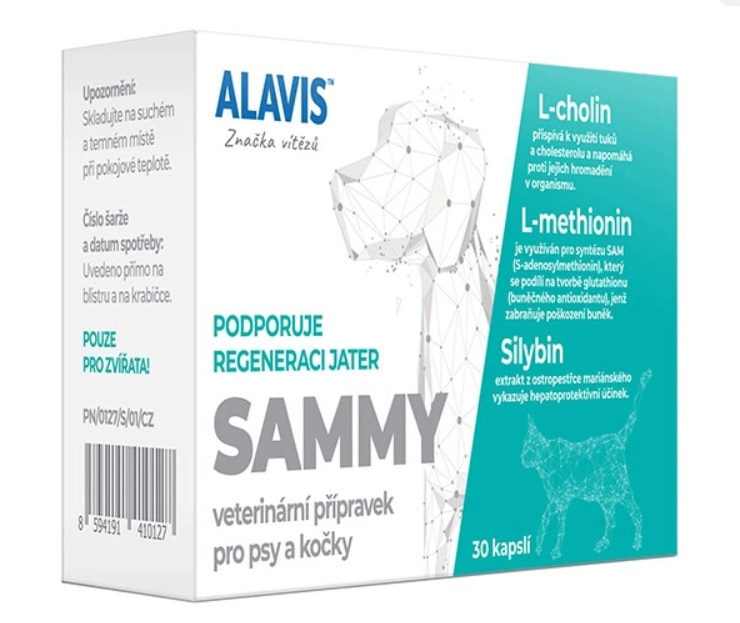 ALAVIS SAMMY je veterinárny prípravok pre psy a mačky obsahujúci kombináciu látok SAM-e a Silybinu – extraktu z pestreca mariánskeho. Obe látky sú známe pre svoj pozitívny vplyv na pečeň a jej regeneráciu.