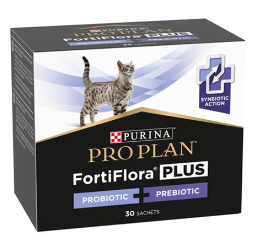 FortiFlora®PLUS je unikátnou kombináciou probiotika a prebiotika poskytujúce synbiotický účinok, je vhodná pre mačky všetkých vekových kategórií (od odstavu). Preukázateľne pomáha udržať zdravý črevný mikróbiom, jeho rovnováhu a odolný imunitný systém. Každé vrecko obsahuje garantované množstvo probiotika (mikroenkapsulovaného na zvýšenie stability a účinnosti) v kombinácii s rastlinným prebiotikom.