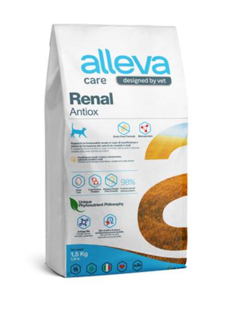 Alleva Care Renal-ANTIOX je kompletné diétne krmivo pre dospelé mačky, odporúčané na podporu funkcie obličiek v prípadoch chronickej alebo akútnej obličkovej nedostatočnosti a na zníženie tvorby oxalátových a urátových kameňov.