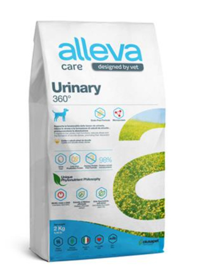 Charakteristika produktu: Alleva Care Urinary 360° obsahuje znížený obsah bielkovín vysokej kvality (celé vajcia) na zníženie tvorby urey, má vlastnosti znižujúce saturáciu moču vďaka nízkej koncentrácii horčíka, fosforu a vyššiemu obsahu sodíka, vlastnosti okysľujúce moč na úpravu pH moču vďaka obsahu síranu vápenatého a DL-metionínu; uvedené charakteristiky vytvárajú prostredie nepriaznivé pre tvorbu struvitových kryštálov. Produkt je obohatený o vysoký obsah glukozamínu, zdroja glykozamíngylkánov (GAG) a chondroitín sulfátu a sušené brusnice, všetky prospešné pre zdravie močového traktu. Na doplnenie receptúry obsahuje diétne krmivo komplex bylín s obsahom polyfenolov, ktoré dokážu obmedziť vplyv oxidačného stresu na všetky telesné systémy a medovku lekársku na podporu upokojenia a zníženie stresu u psa, ktorý je predispozíciou vzniku ochorení močového traktu.