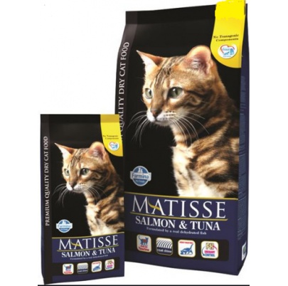 Matisse Salmon & Tuna je kompletné a vyvážené krmivo pre dospelé mačky s normálnou fyzickou aktivitou. Obsahuje najlepšie ingrediencie pre zdravú a vyváženú stravu. Losos, tuniak a ryža zaručujú vhodný príjem bielkovín ako aj vysokú stráviteľnosť. Podporuje chuť do jedla, obsahuje správne množstvo taurínu, esenciálneho proteínu, vyvážené množstvo omega 3 a 6 nenasýtených mastných kyselín, všetky vitamíny a minerálne látky potrebné pre správnu a vyváženú stravu. Matisse Salmon & Tuna neobsahuje geneticky modifikované zložky.