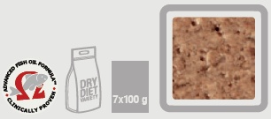 Bravčové, hovädzie, predželatínovaný ryža, ryby, vajcia, minerály (vrátane zeolitu), slnečnicový olej, vitamíny a stopové prvky, struky skorocelu štiavolistý (psyllium), repné odrezky, kvasnice (zdroj β-1,3 / 1,6-glukánov a mannan-oligosacharidov), taurín, metionín, extrakt z yuky. Neobsahuje umelé farbivá, aromatické látky ani antioxidanty.